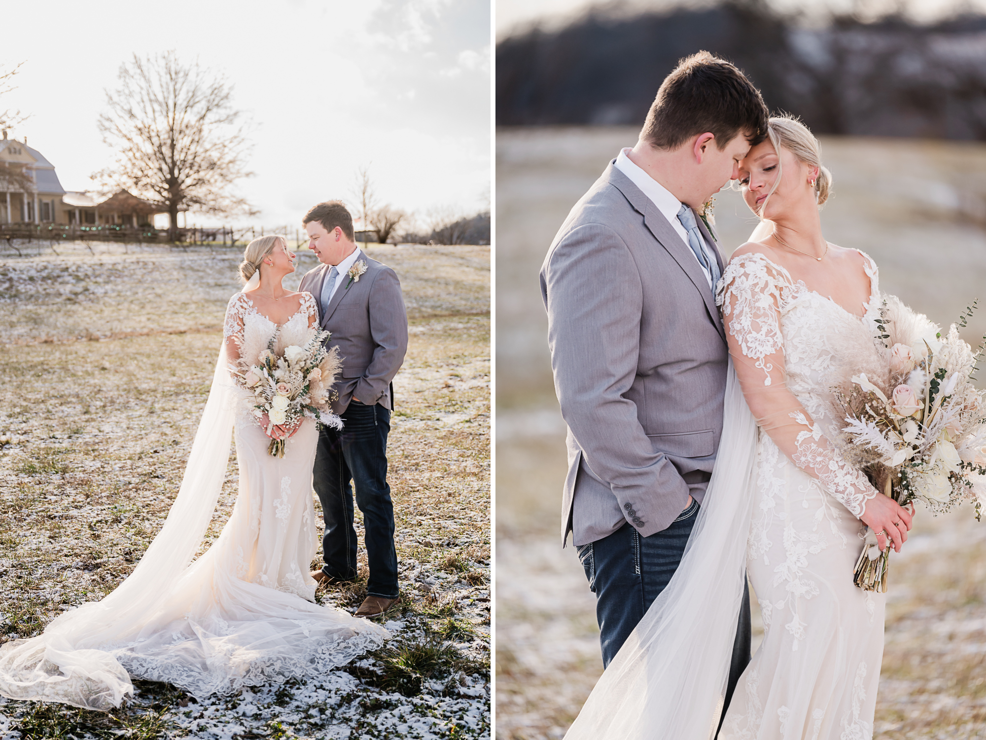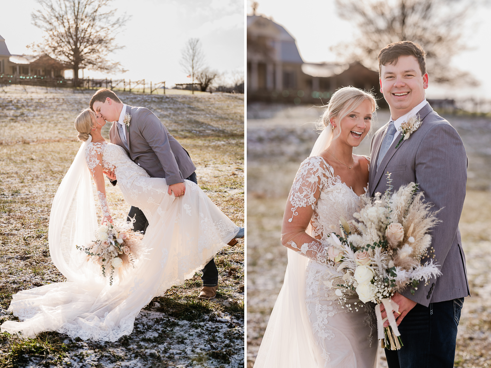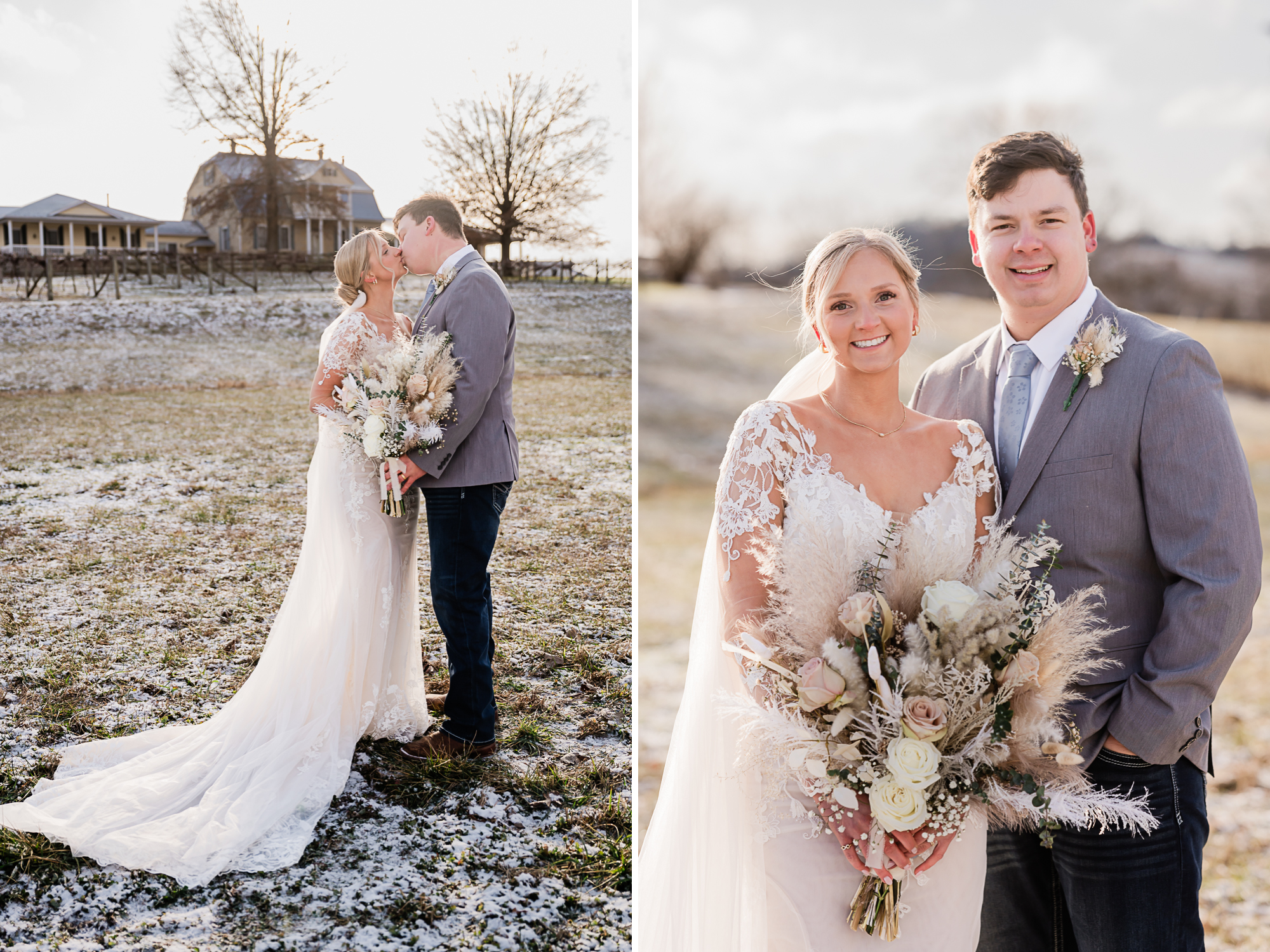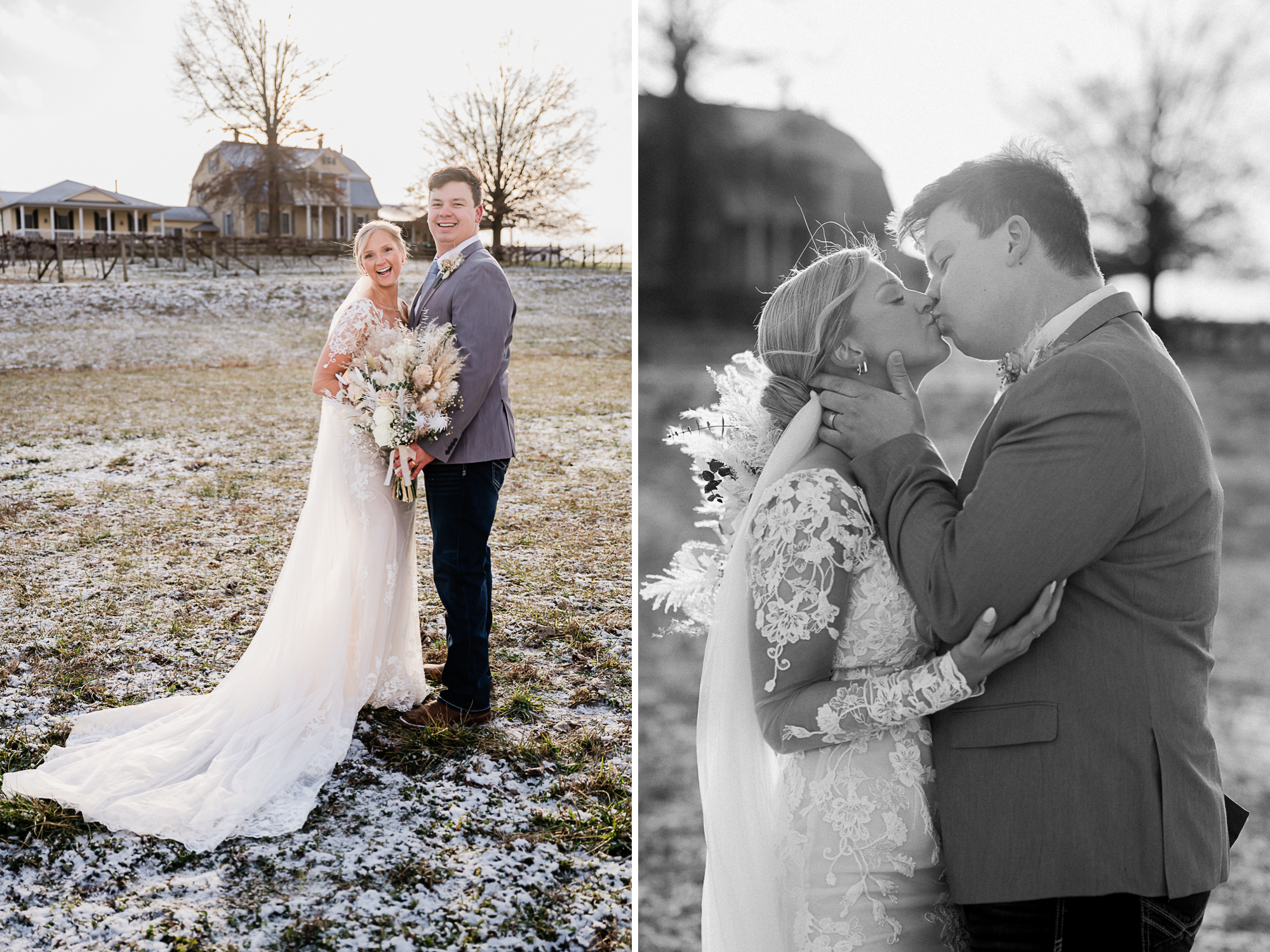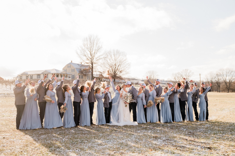 Next, we stopped at the Westphalia Winery for portraits. Just as we arrived, the sun made a beautiful appearance, casting golden light across the fields, but it did very little to warm the temperatures. The cold was intense, but JoDee and Tony powered through as we captured a handful of quick bridal party portraits and bride and groom portraits in record time before rushing back inside to warm up.