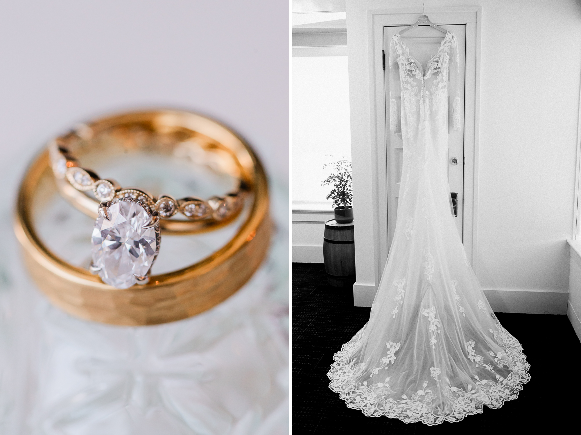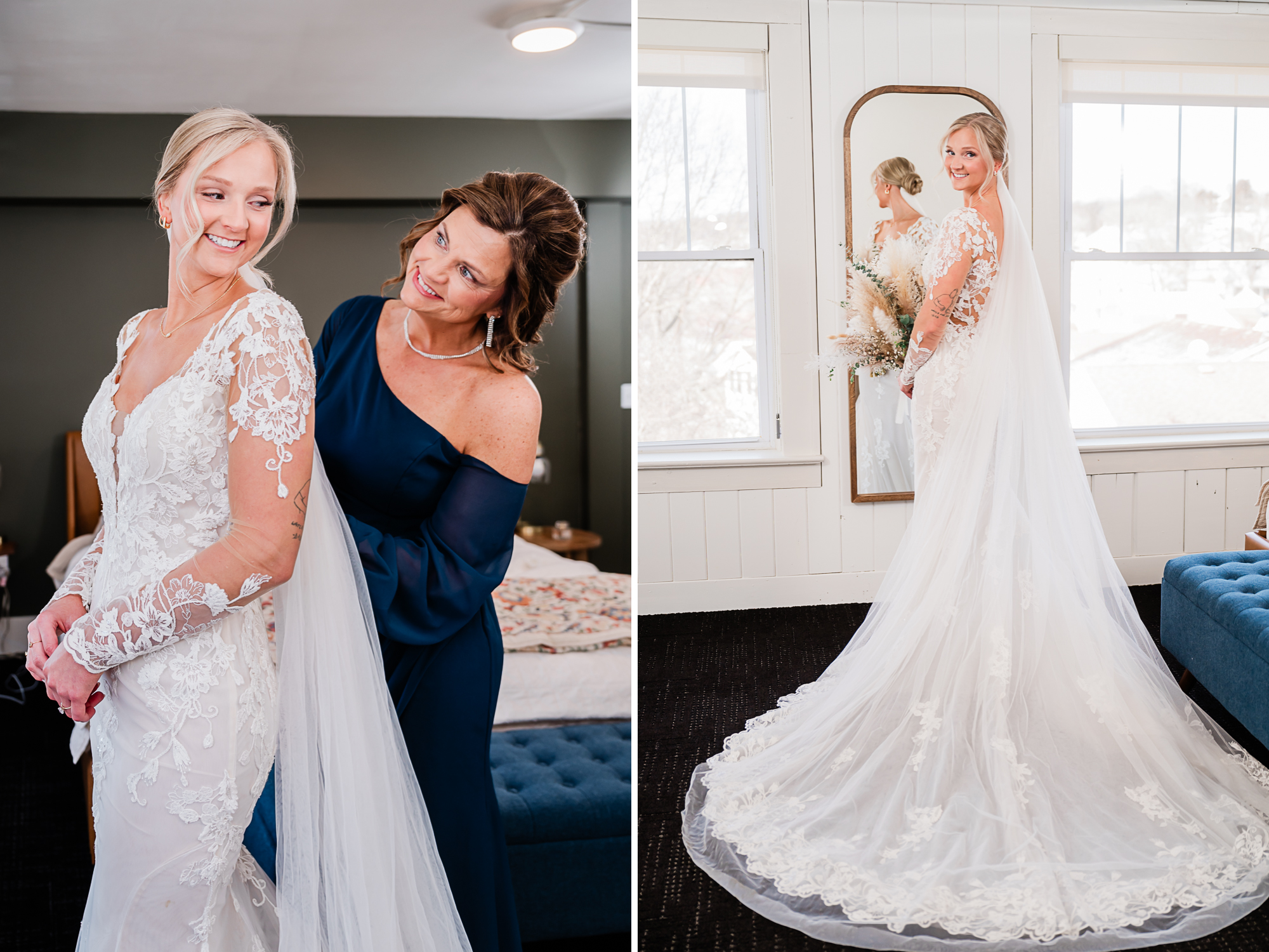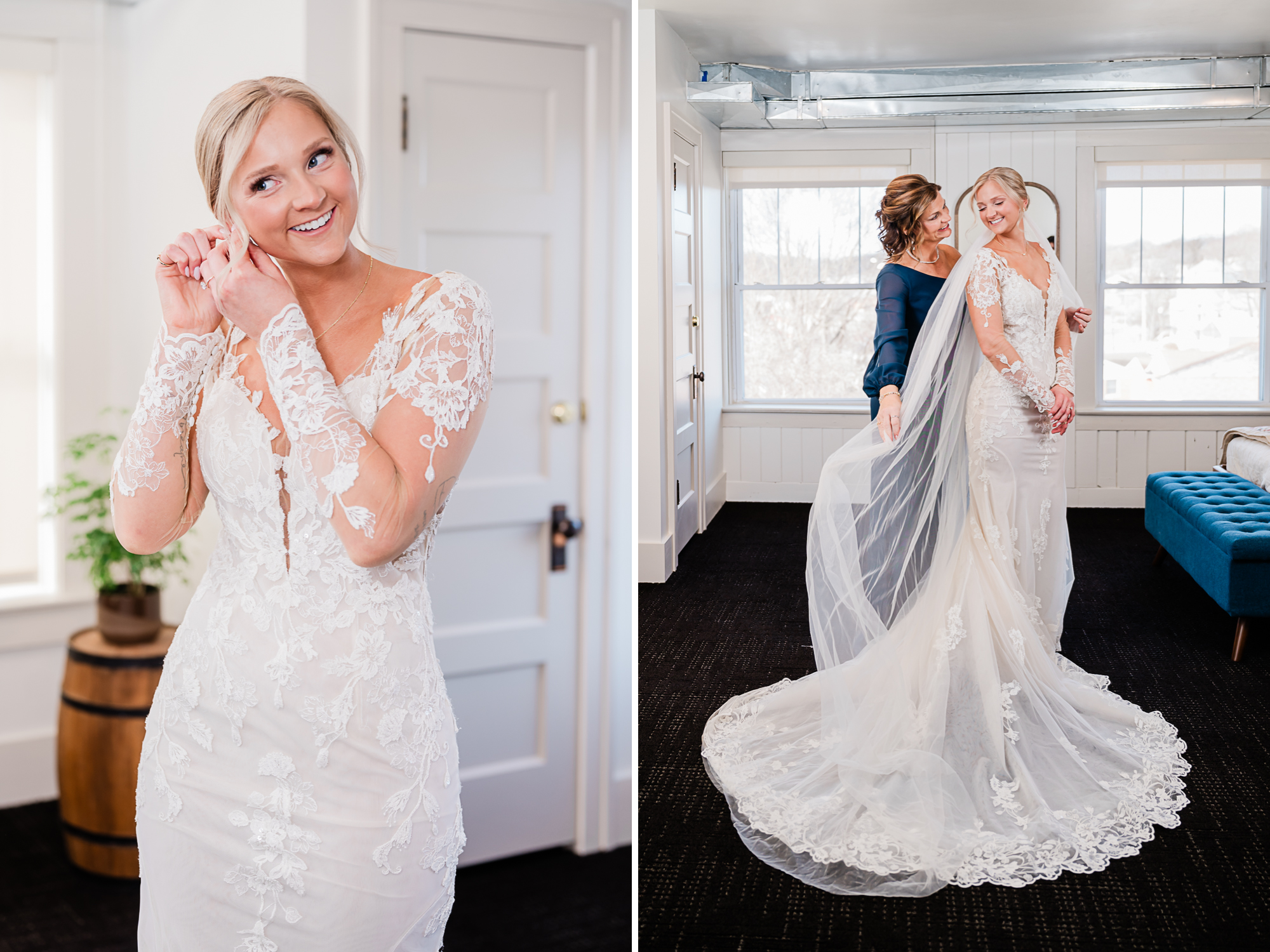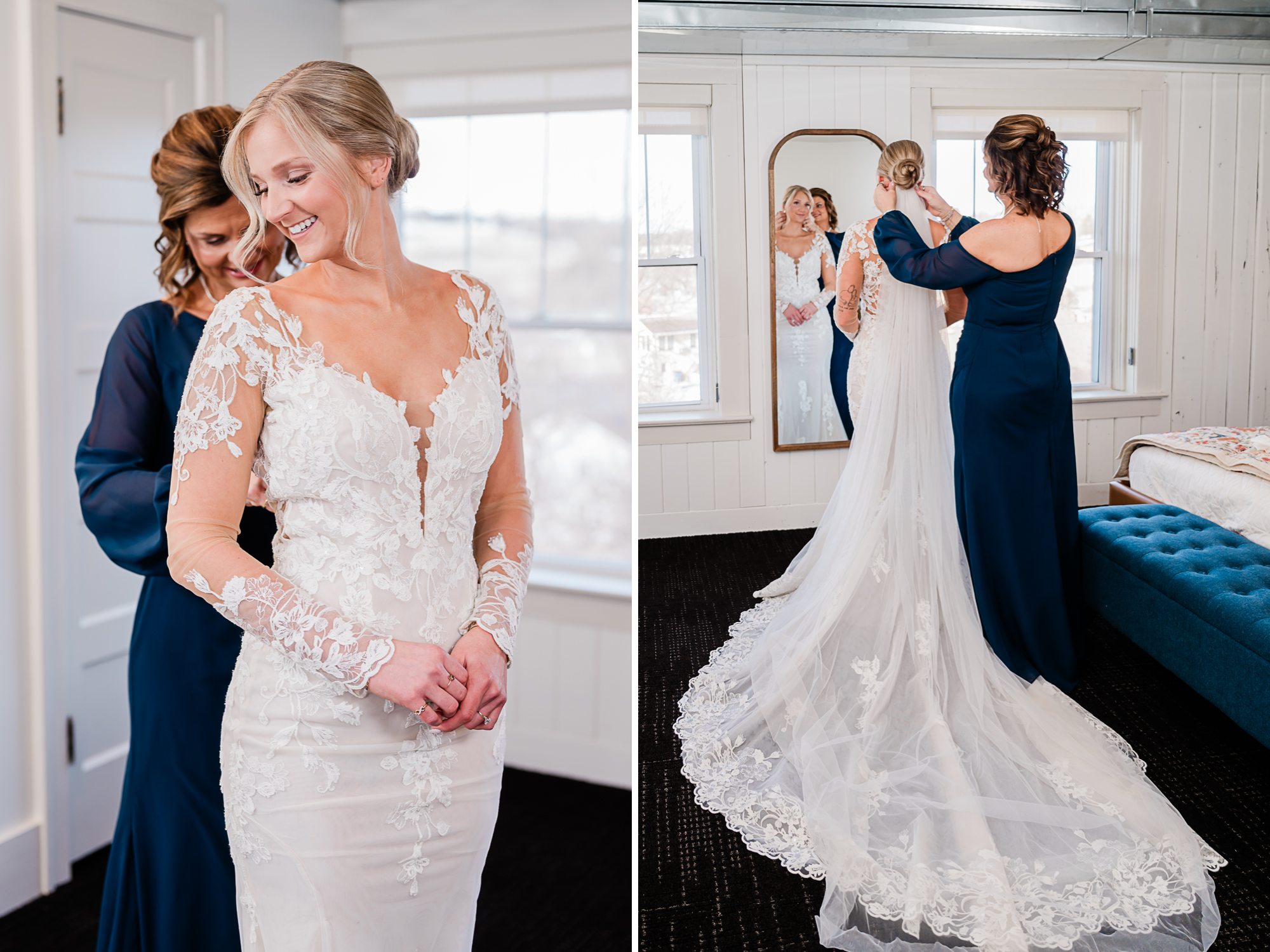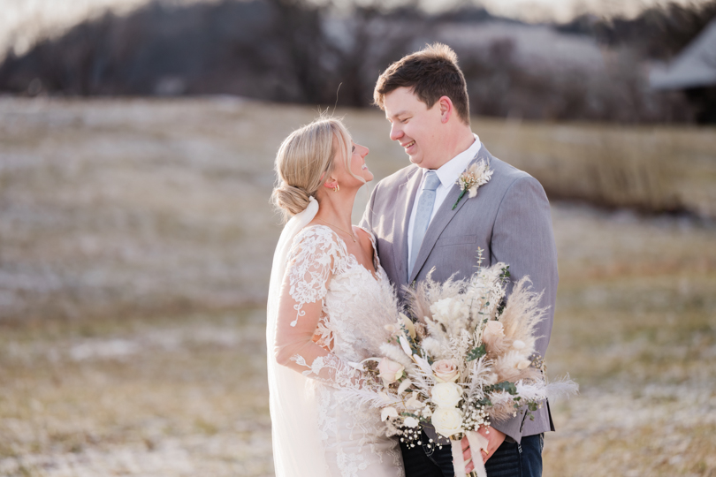 Next, we stopped at the Westphalia Winery for portraits. Just as we arrived, the sun made a beautiful appearance, casting golden light across the fields, but it did very little to warm the temperatures. The cold was intense, but JoDee and Tony powered through as we captured a handful of quick bridal party portraits and bride and groom portraits in record time before rushing back inside to warm up.