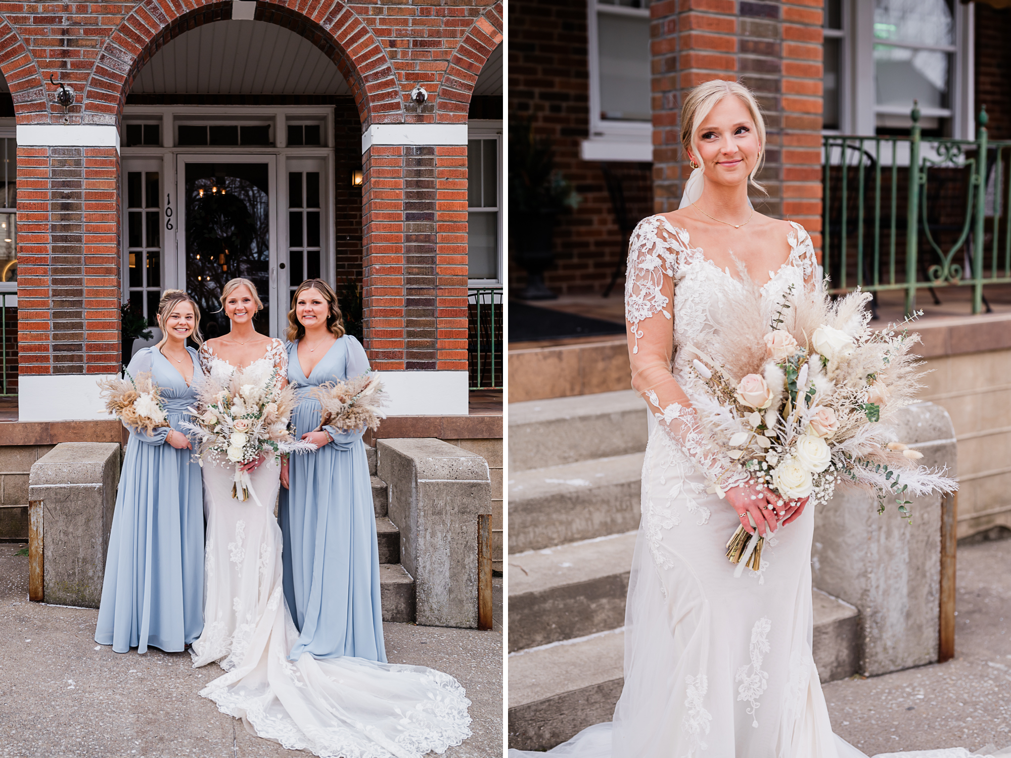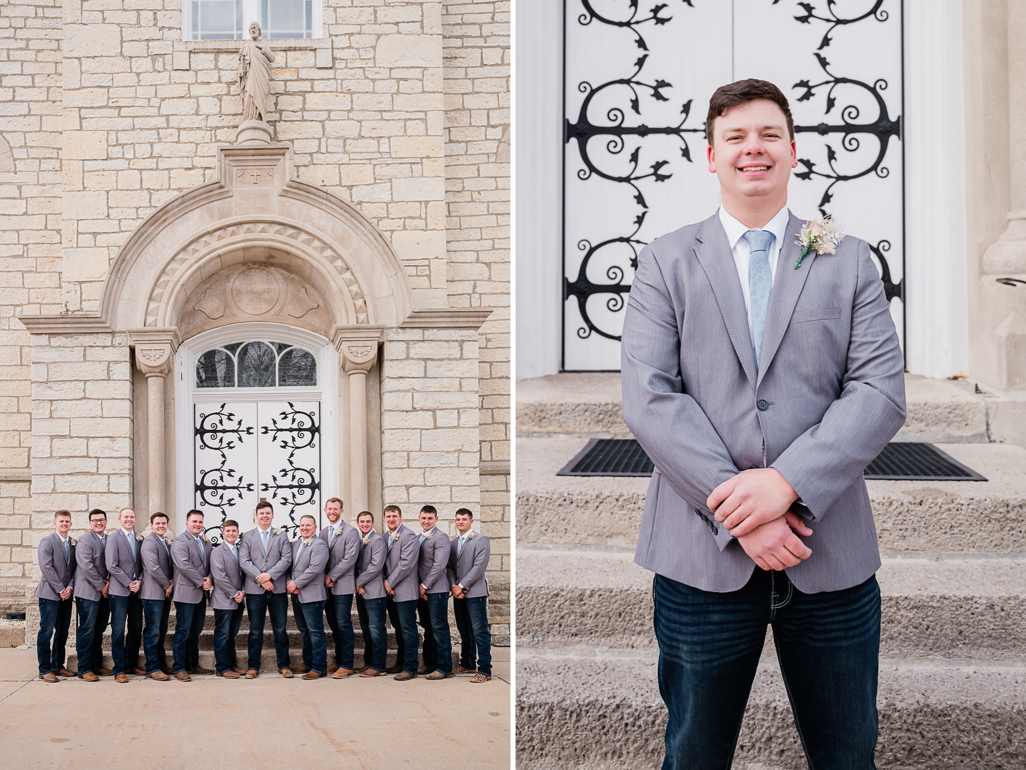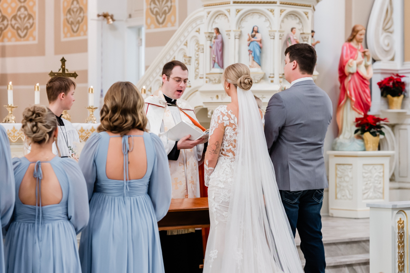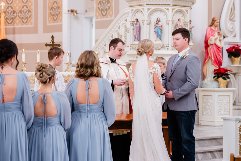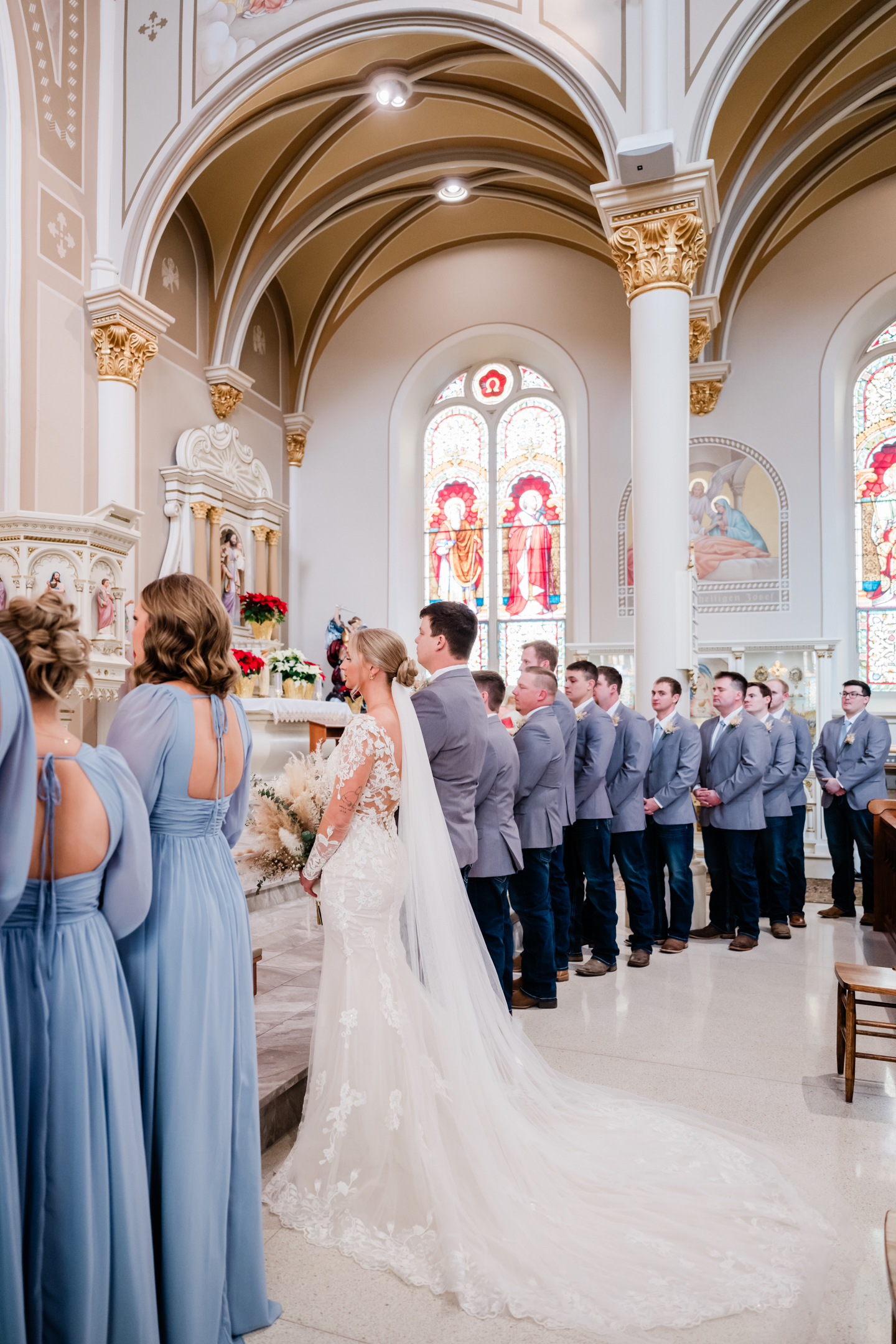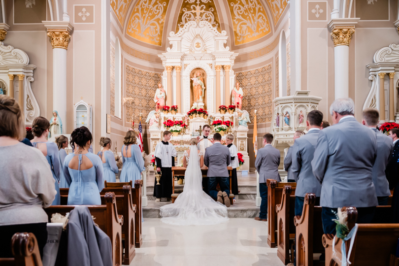 We ventured outside the Westphalia Inn for bridesmaid portraits, and these ladies were absolute troopers. The wind was fierce and the temperatures were beyond cold, but they handled it with grace and smiles before we quickly made our way across the street to St. Joseph Catholic Church.