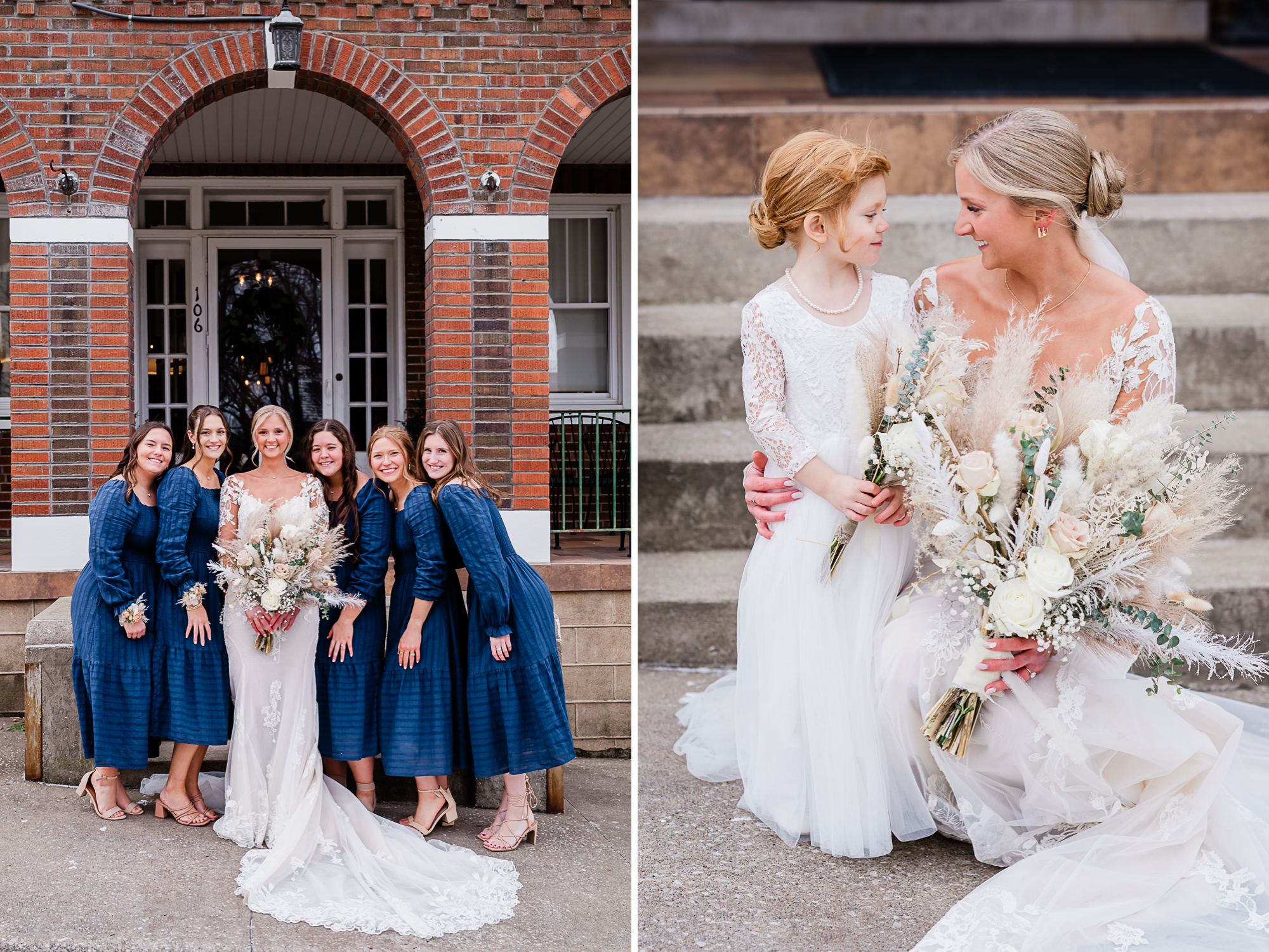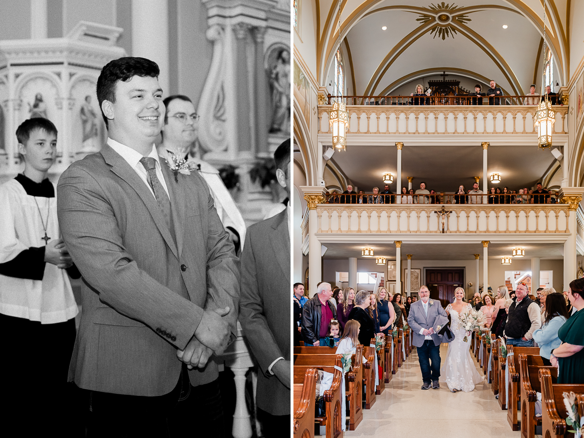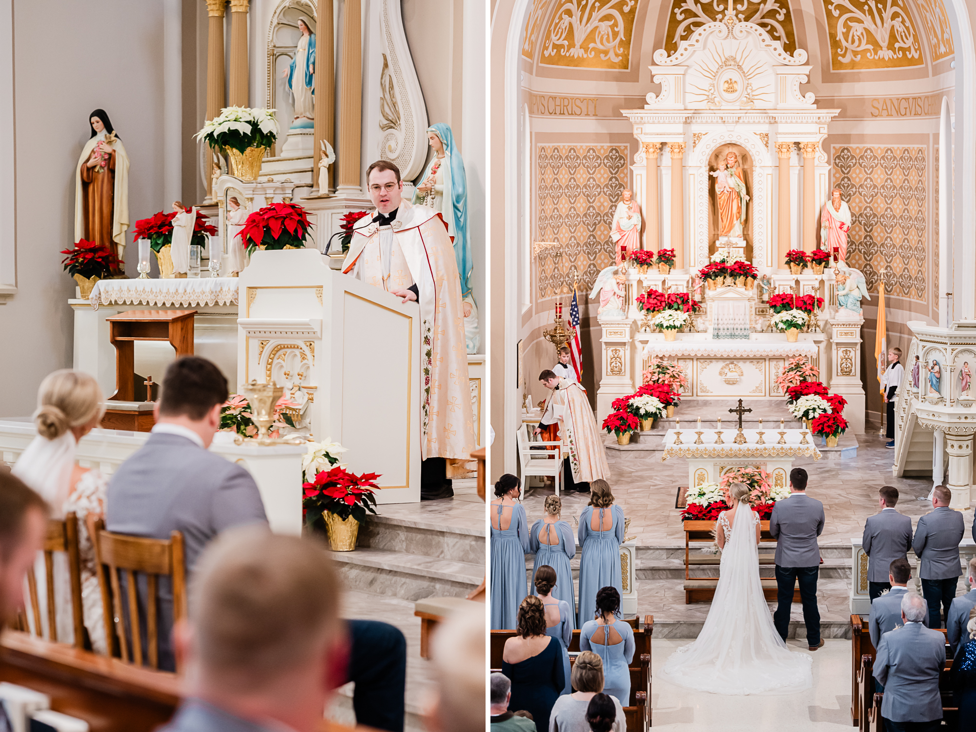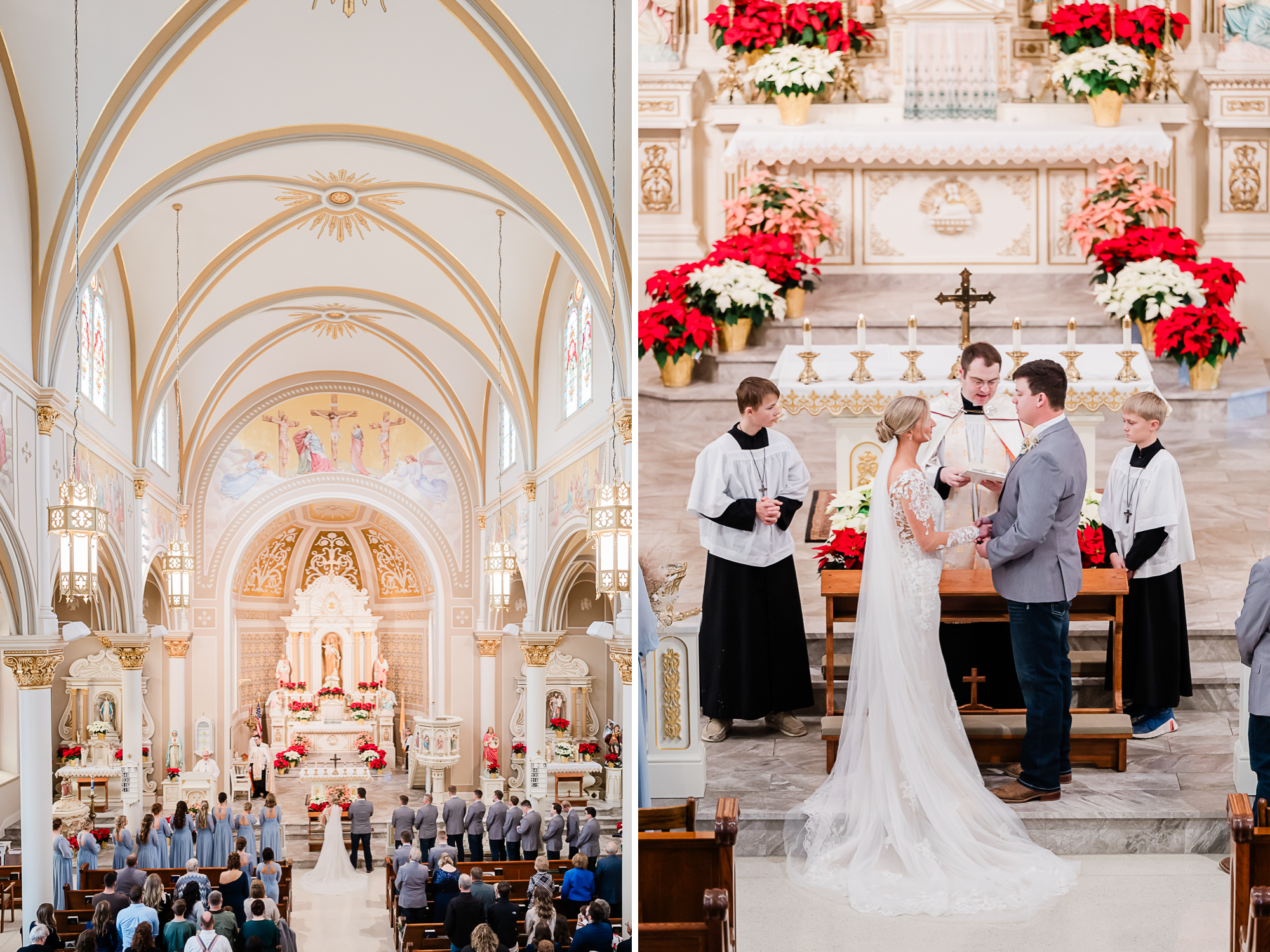 We ventured outside the Westphalia Inn for bridesmaid portraits, and these ladies were absolute troopers. The wind was fierce and the temperatures were beyond cold, but they handled it with grace and smiles before we quickly made our way across the street to St. Joseph Catholic Church.