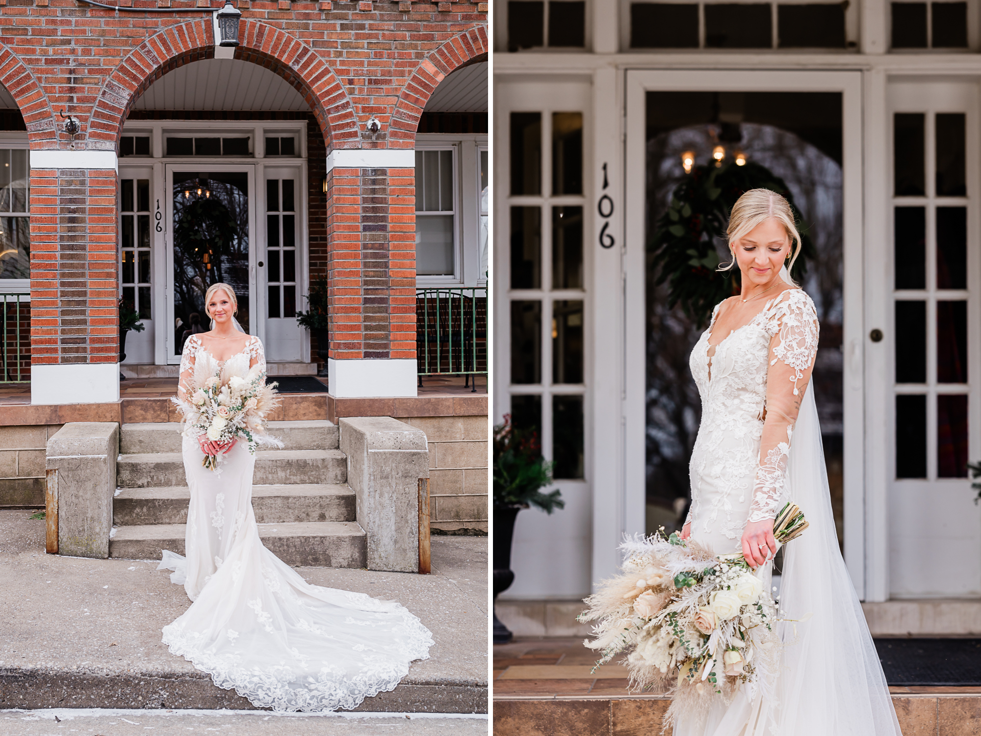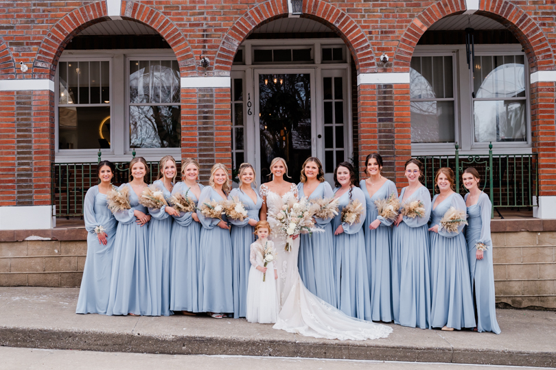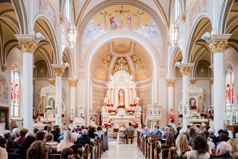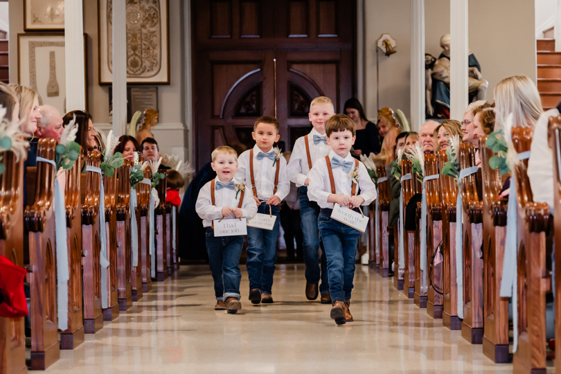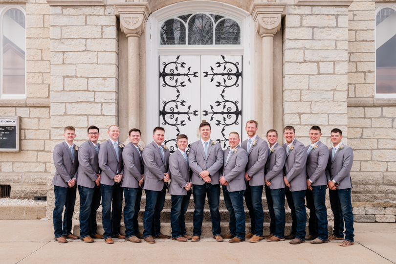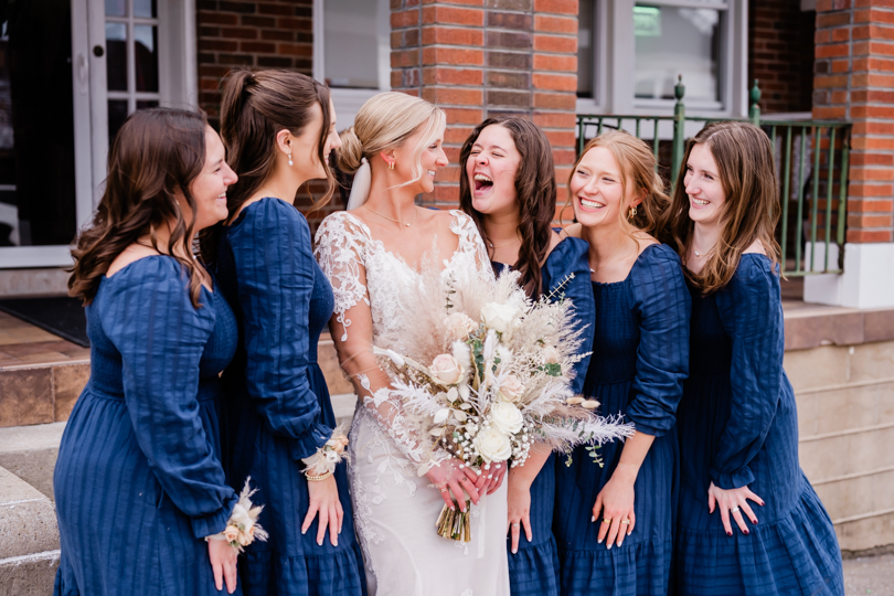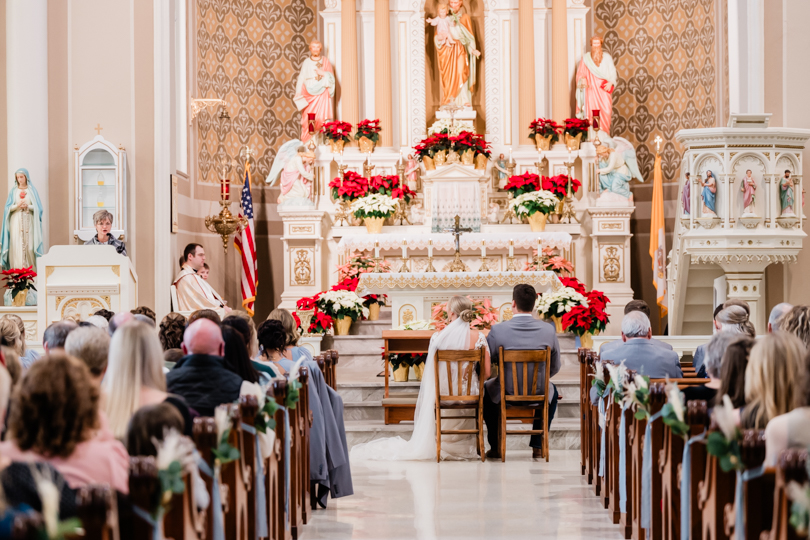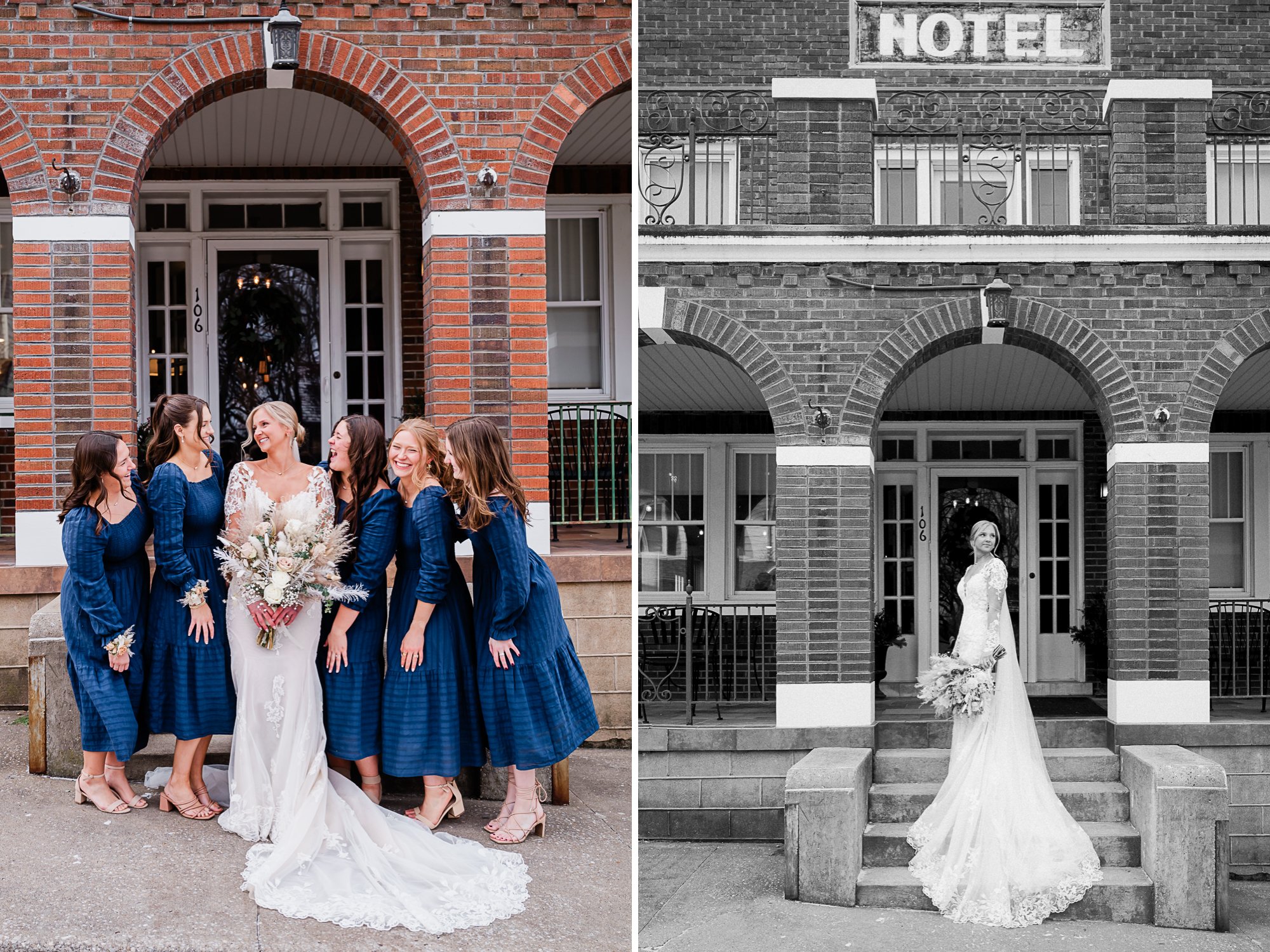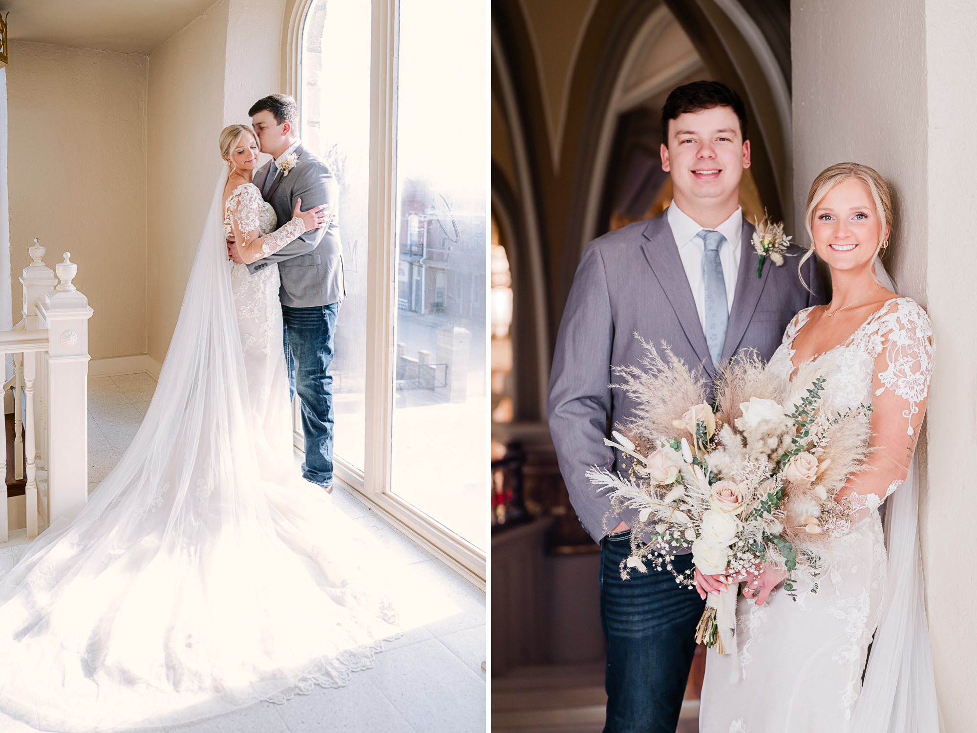 We ventured outside the Westphalia Inn for bridesmaid portraits, and these ladies were absolute troopers. The wind was fierce and the temperatures were beyond cold, but they handled it with grace and smiles before we quickly made our way across the street to St. Joseph Catholic Church.