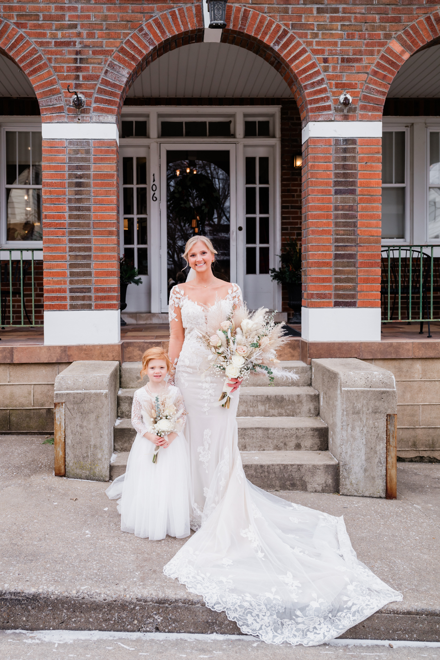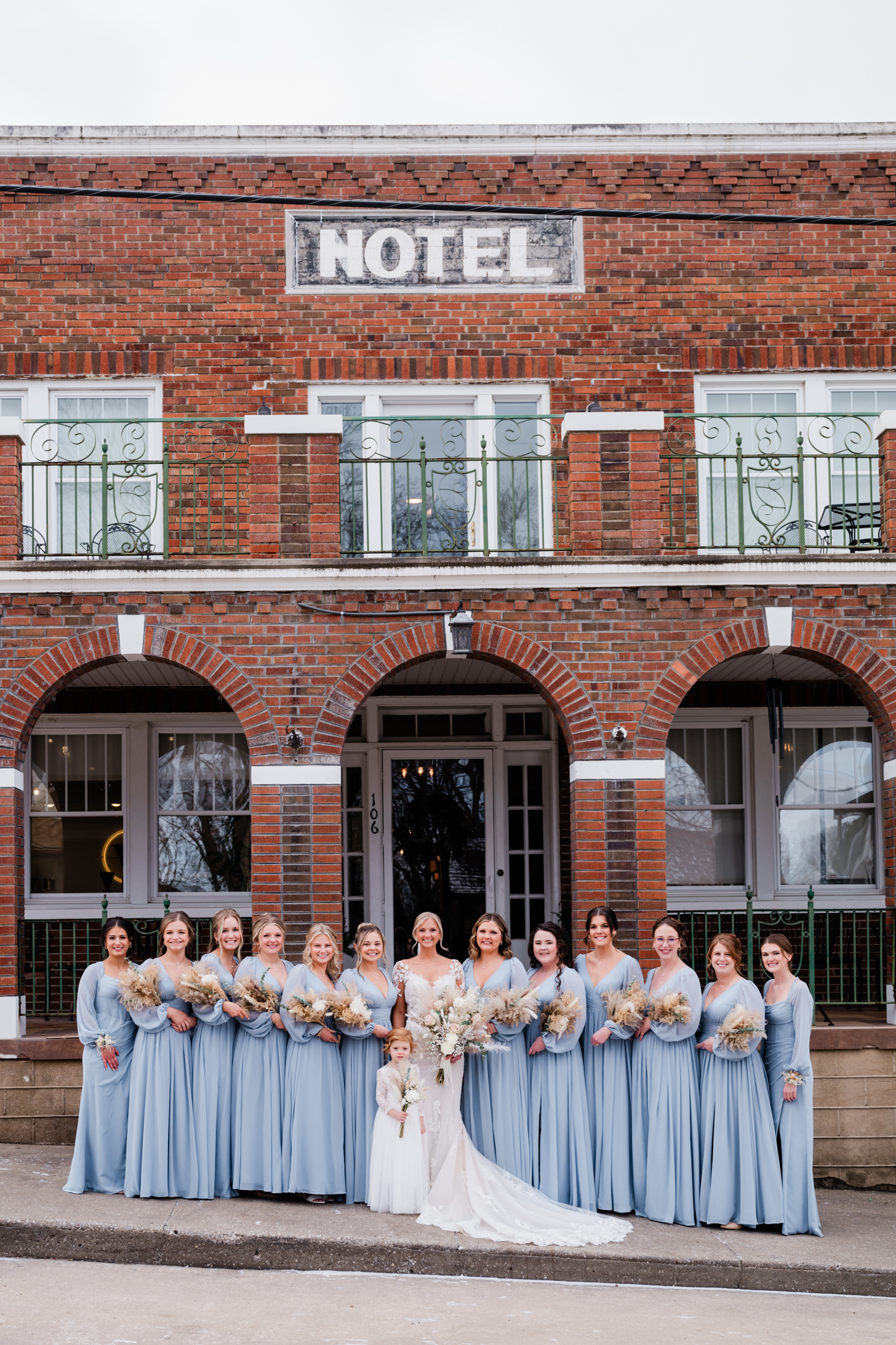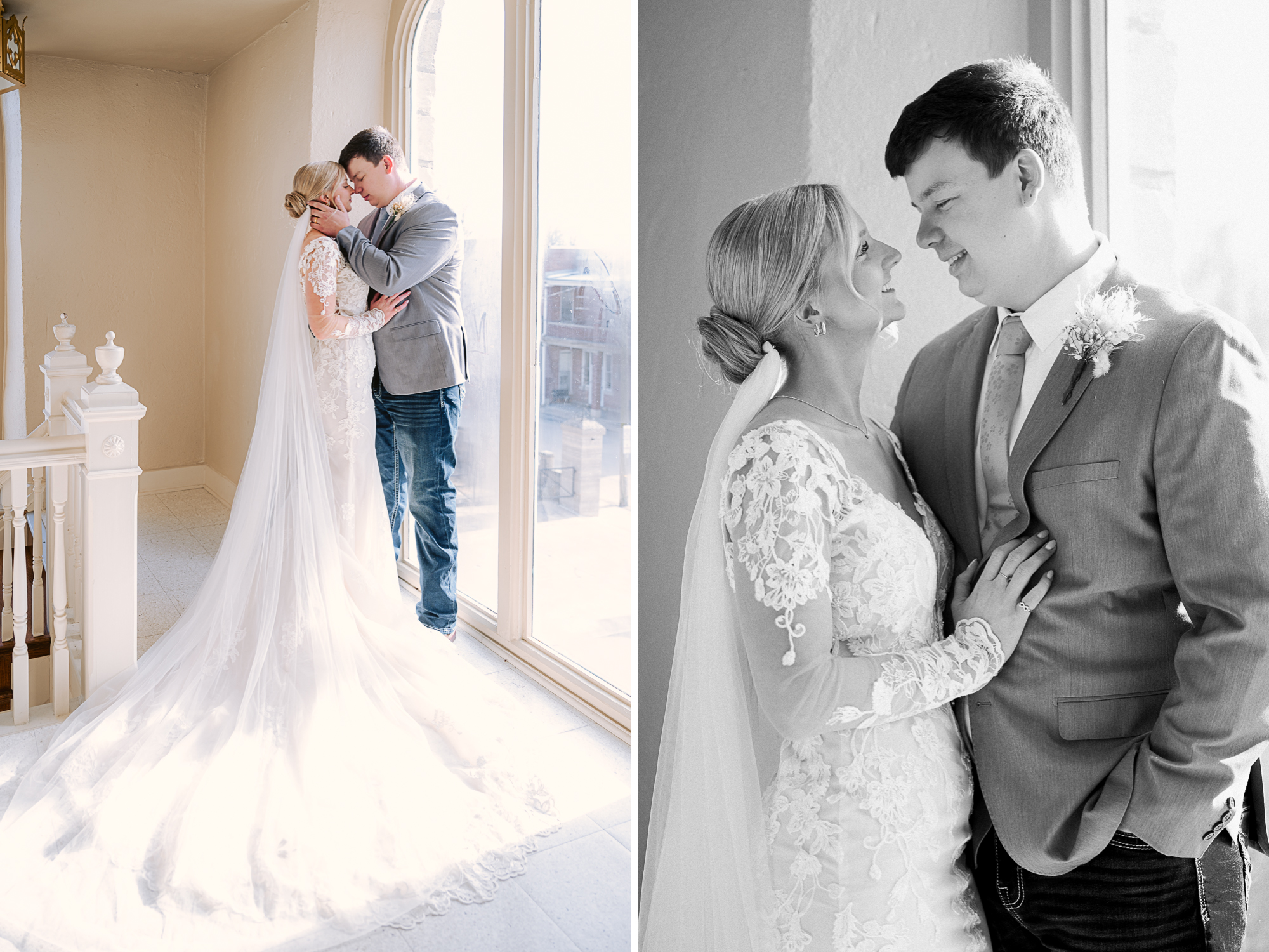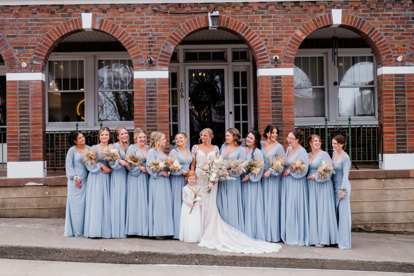 We ventured outside the Westphalia Inn for bridesmaid portraits, and these ladies were absolute troopers. The wind was fierce and the temperatures were beyond cold, but they handled it with grace and smiles before we quickly made our way across the street to St. Joseph Catholic Church.