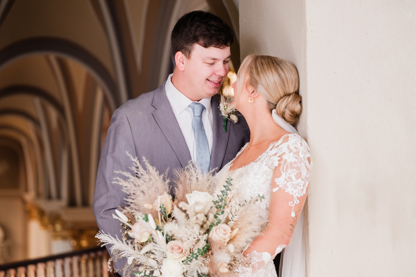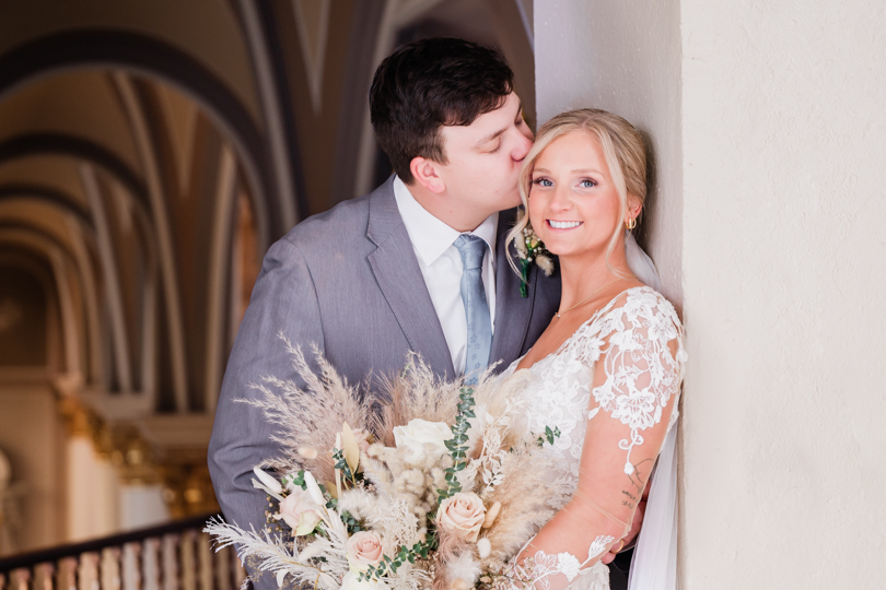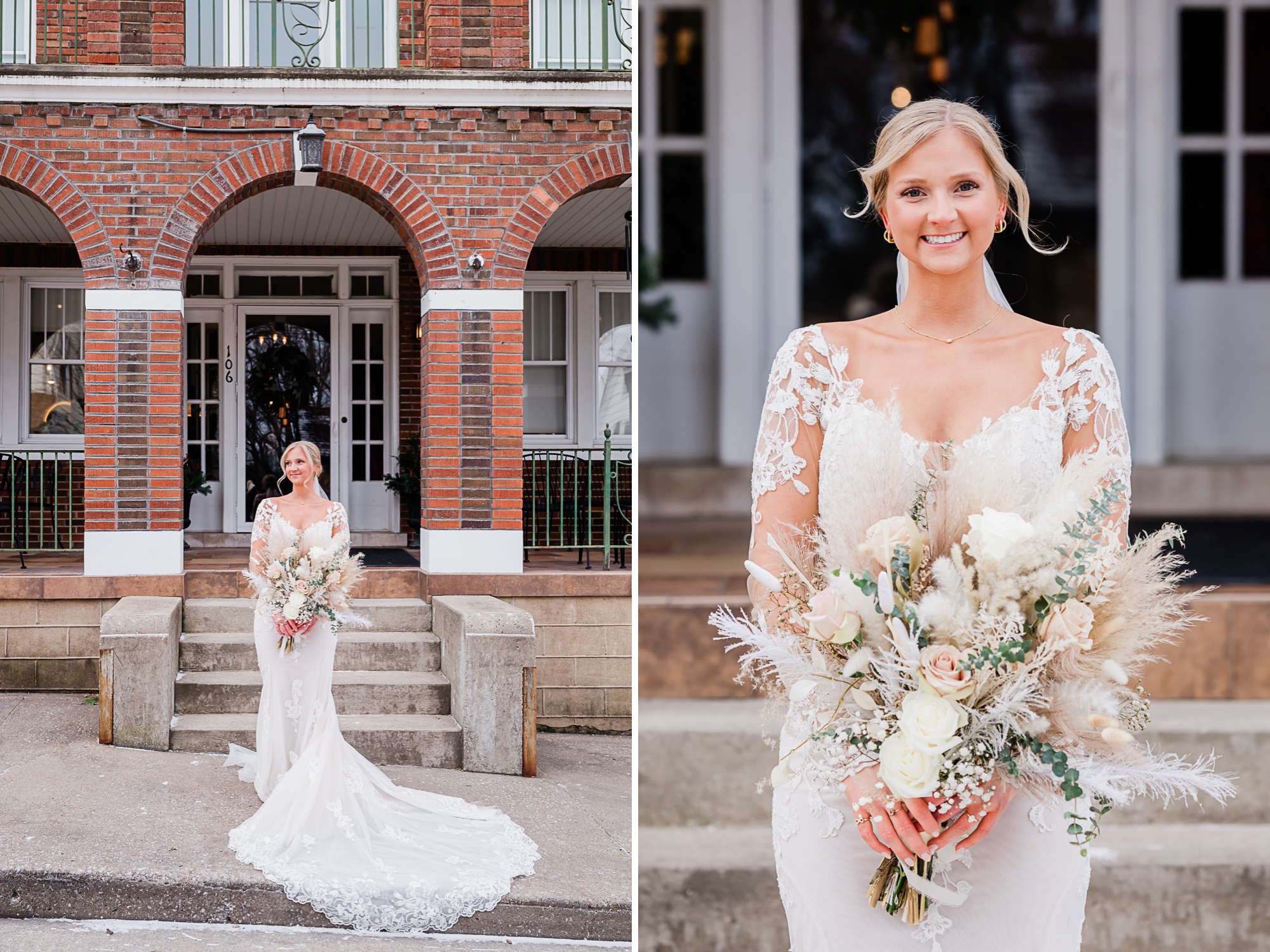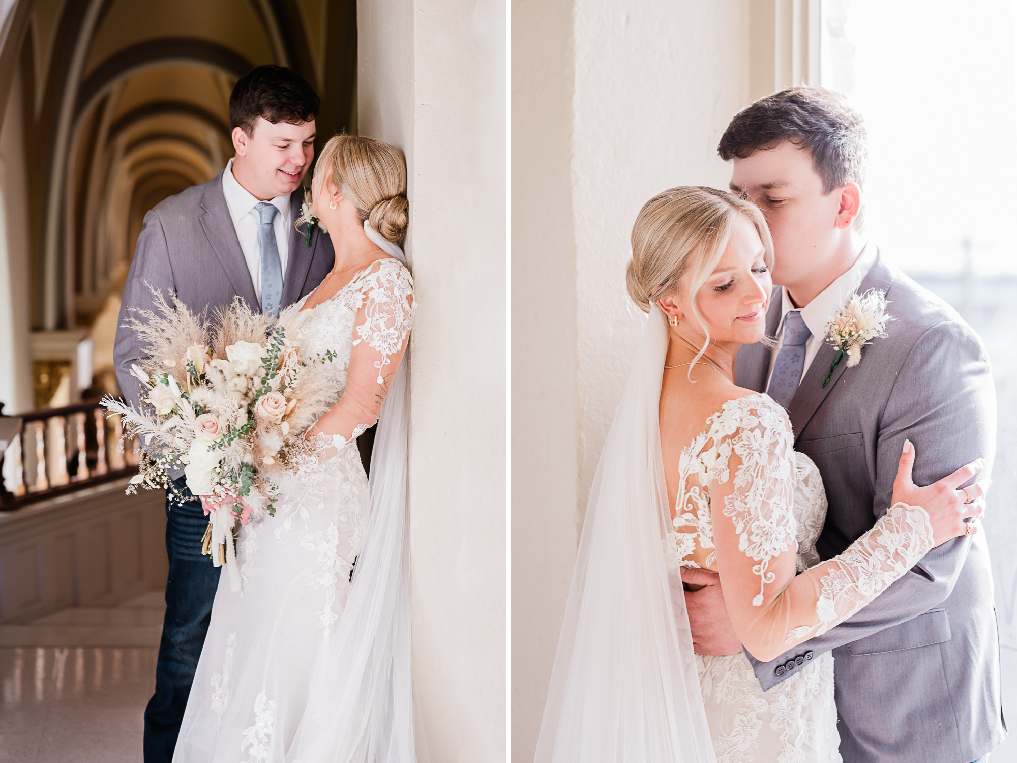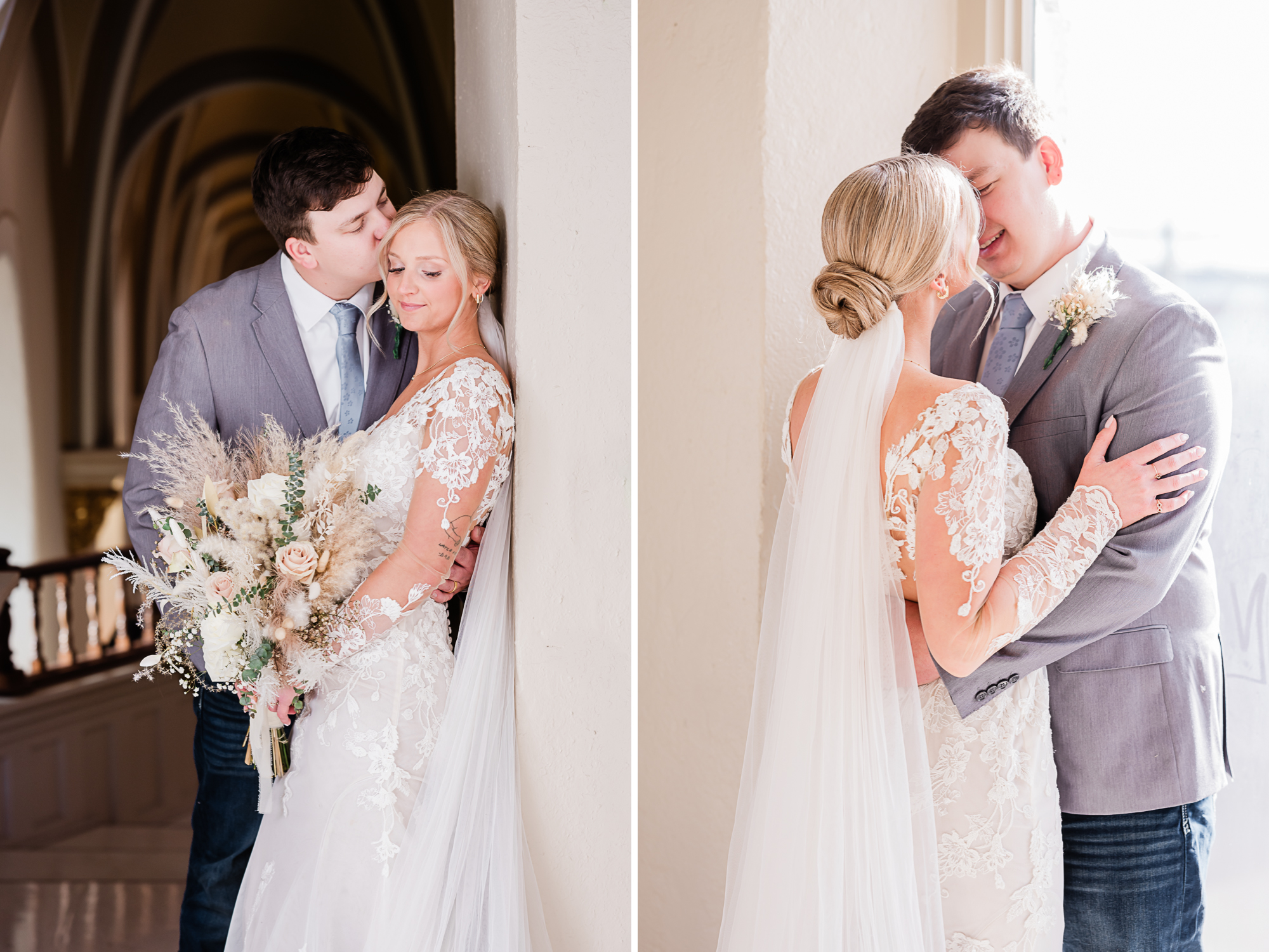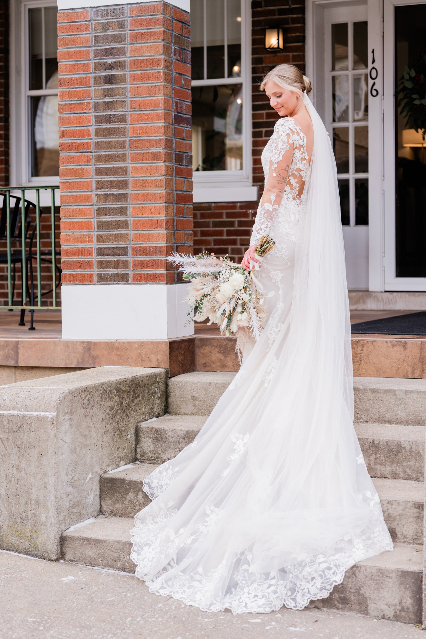 We ventured outside the Westphalia Inn for bridesmaid portraits, and these ladies were absolute troopers. The wind was fierce and the temperatures were beyond cold, but they handled it with grace and smiles before we quickly made our way across the street to St. Joseph Catholic Church.