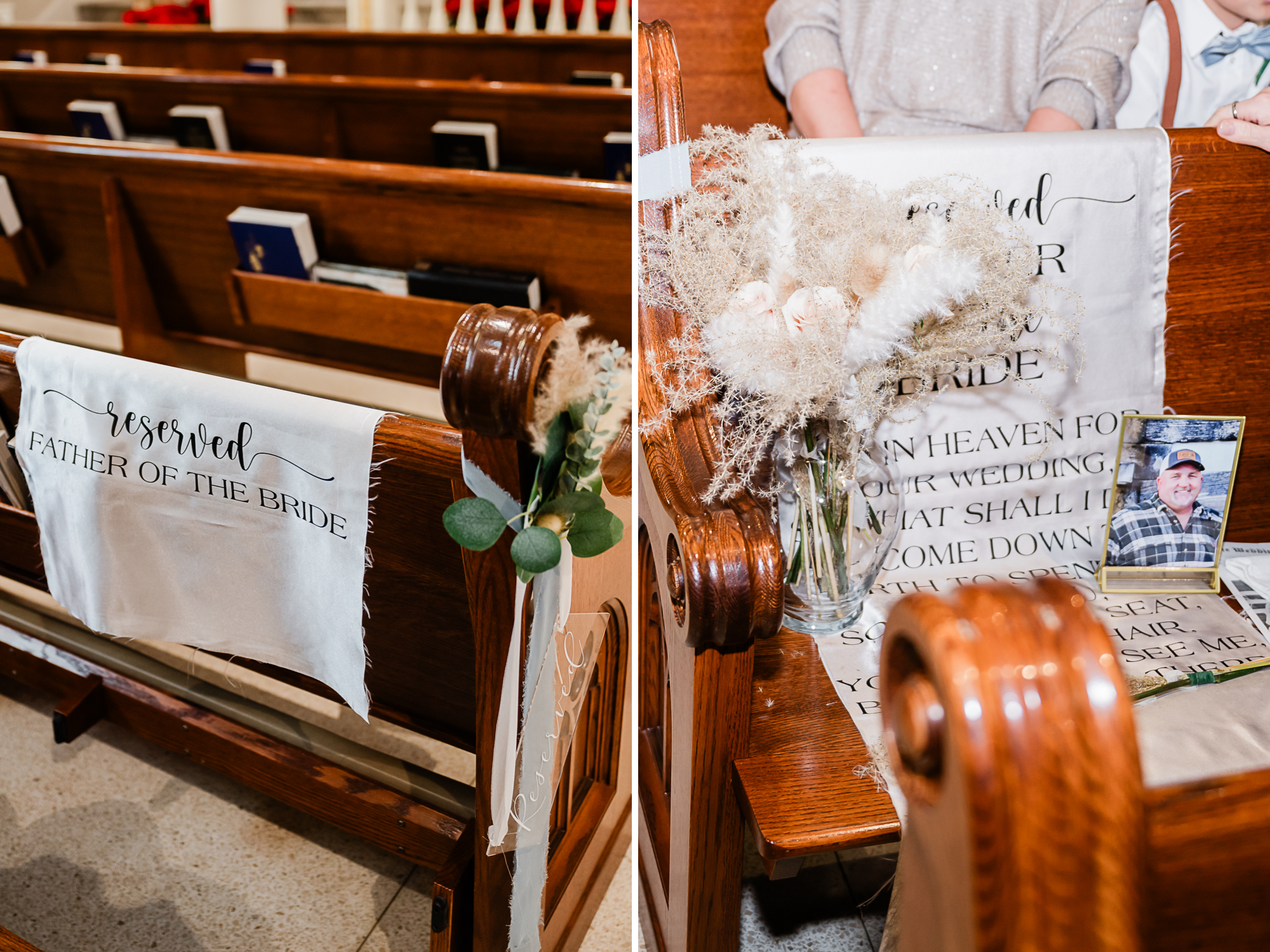 JoDee carried her dad’s jacket with her as she walked down the aisle, an incredibly touching tribute. She stopped at the pew reserved for him, carefully placing his jacket on the seat. A linen reading “Reserved for the Father of the Bride” was draped across the pew, with his photo placed beside a vase of flowers, honoring her dad, Patrick, lovingly known as “Crotch” by family and friends.
