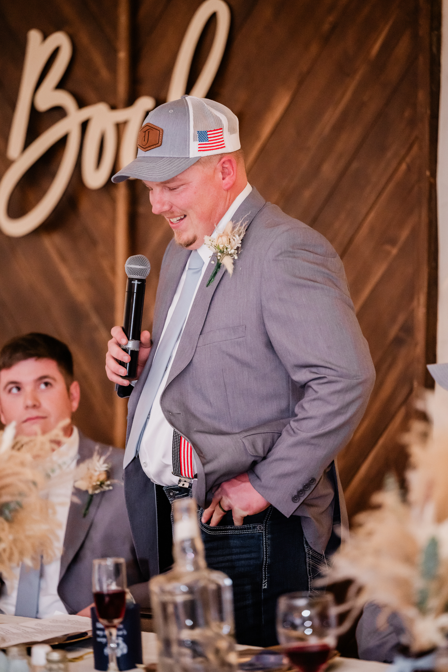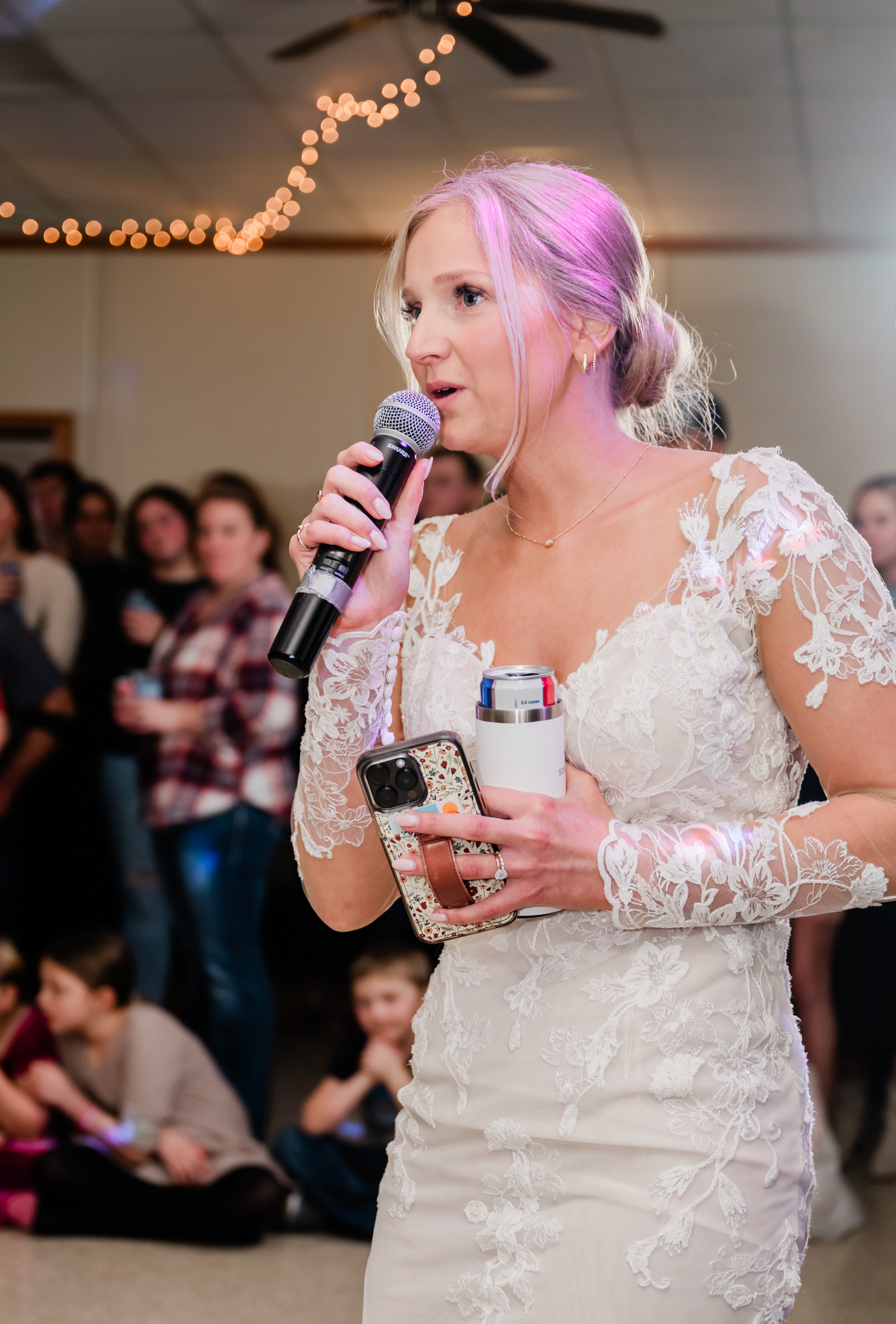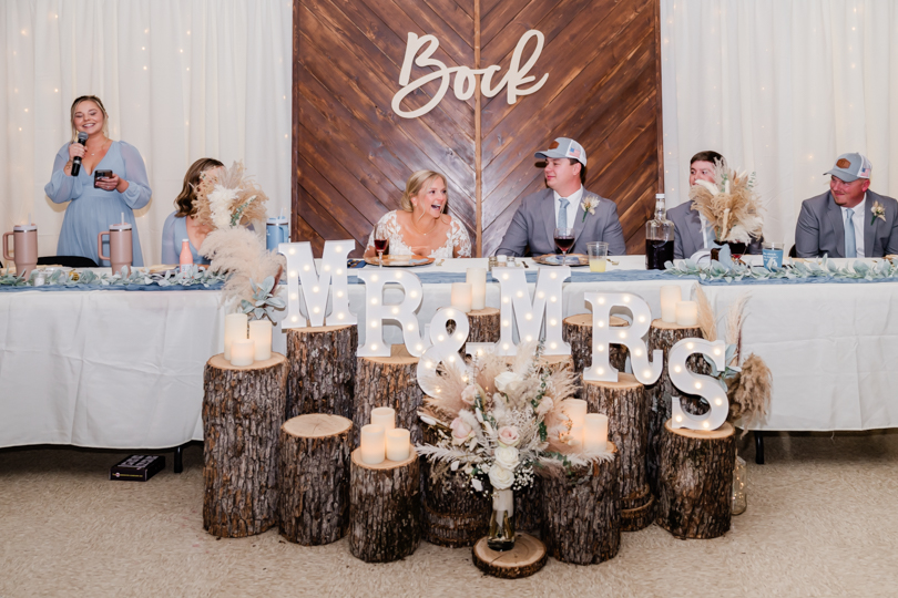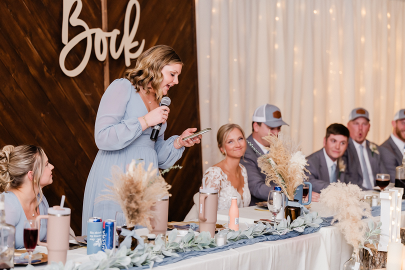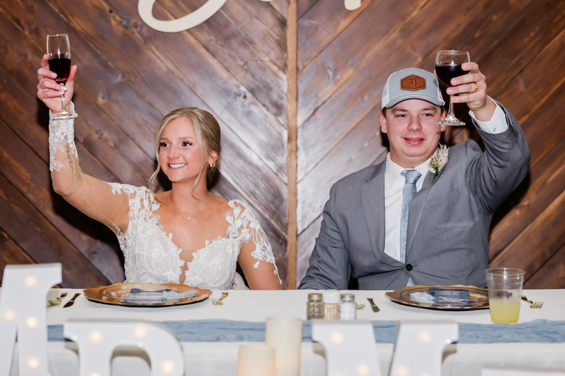 The reception was packed with loved ones ready to celebrate the newlyweds! Guests mingled, shared stories, and enjoyed drinks before the wedding party arrived. Once inside, toasts followed, bringing both laughter and tears throughout the room. JoDee’s mom delivered an especially powerful speech honoring her late husband that had many guests wiping away tears.