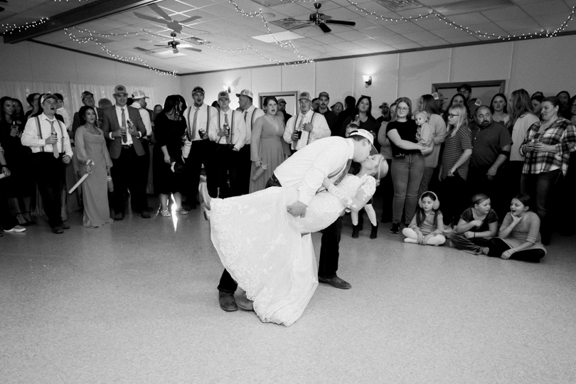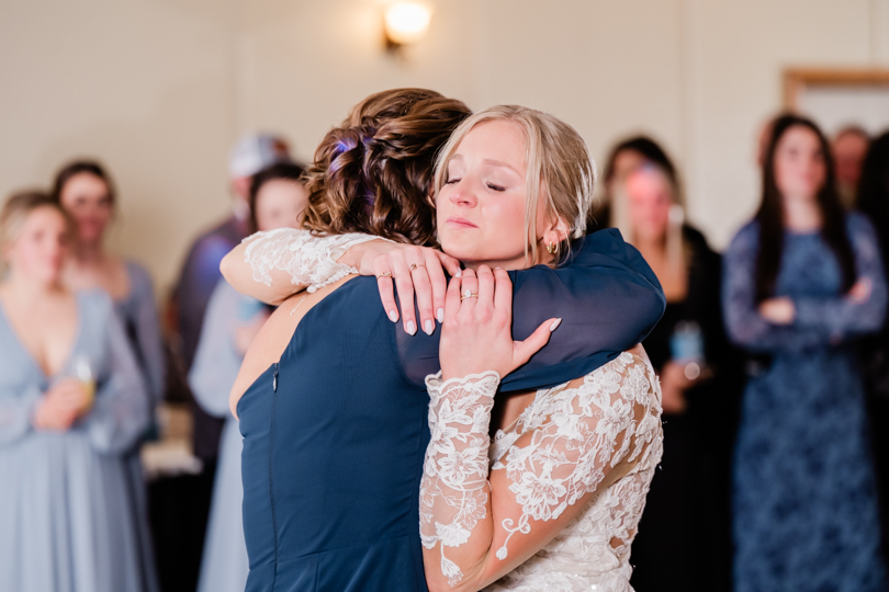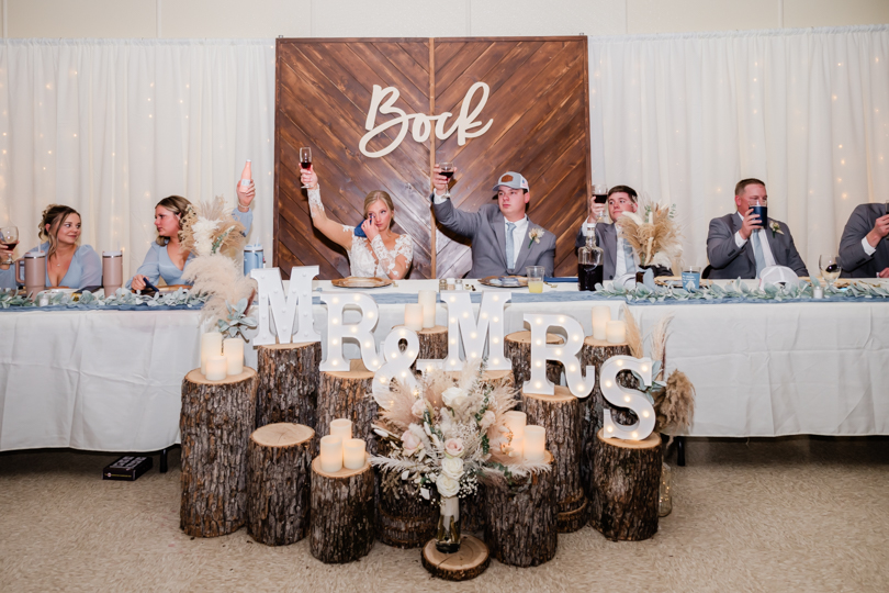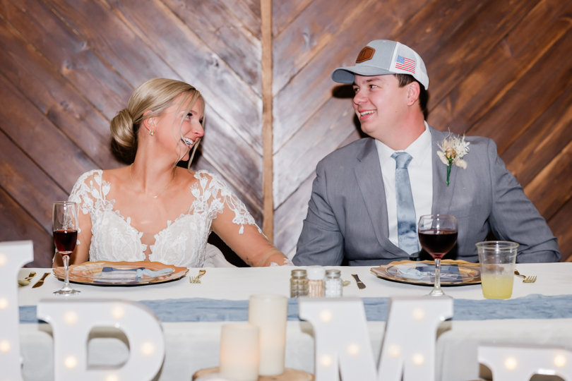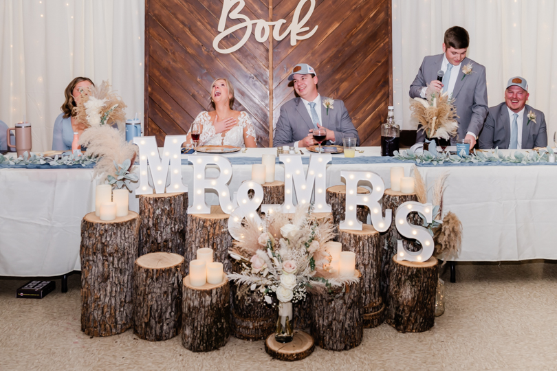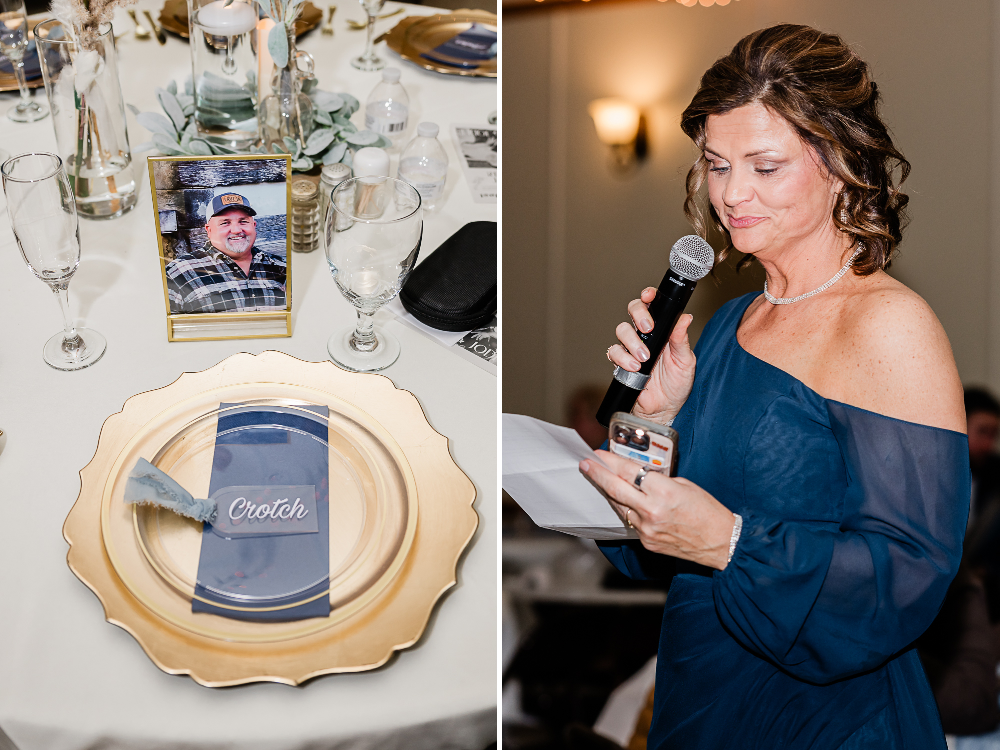 The reception was packed with loved ones ready to celebrate the newlyweds! Guests mingled, shared stories, and enjoyed drinks before the wedding party arrived. Once inside, toasts followed, bringing both laughter and tears throughout the room. JoDee’s mom delivered an especially powerful speech honoring her late husband that had many guests wiping away tears.